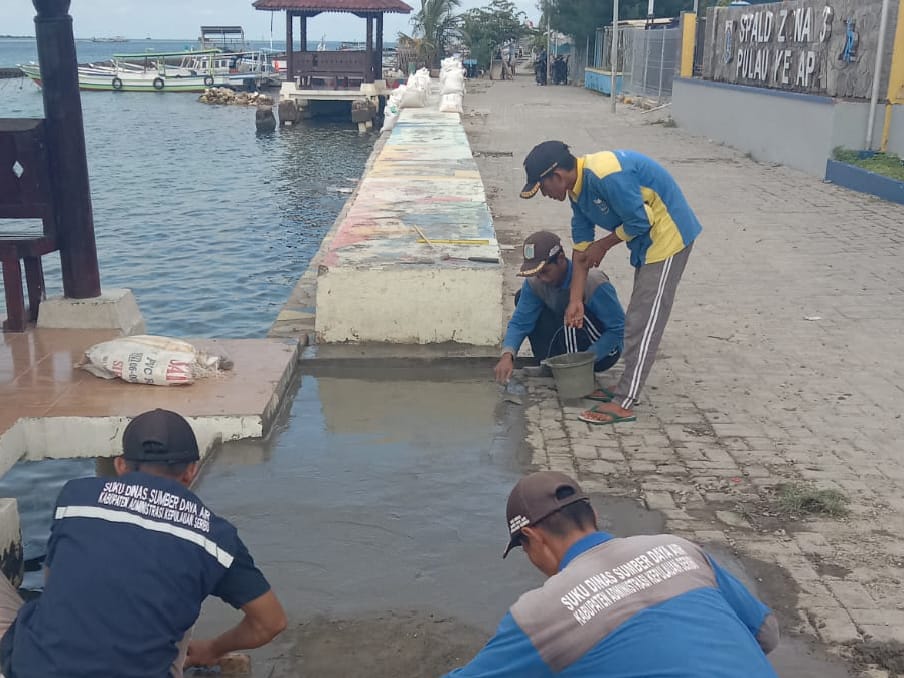 Petugas Suku Dinas Sumber Daya Air (Sudin SDA) Kepulauan Seribu, melakukan perawatan tanggul di kawasan Dermaga Pantura RT 01 dan RT 06 RW 02, Kelu ..