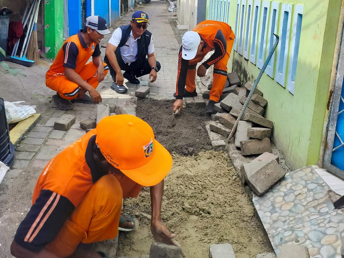 Petugas Penanganan Prasarana dan Sarana Umum (PPSU) Kelurahan Pulau Harapan, Kecamatan Kepulauan Seribu Utara, menuntaskan perbaikan jalan rusak di ..