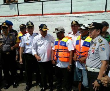 Menteri Perhubungan (Menhub) Budi Karya Sumadi melakukan sidak (inspeksi mendadak) sejumlah alat keselamatan (life jacket) milik kapal tradisional (kapal ojek) Kepulauan Seribu di Pelabuhan Kali Adem, Penjaringan, Jakart ..