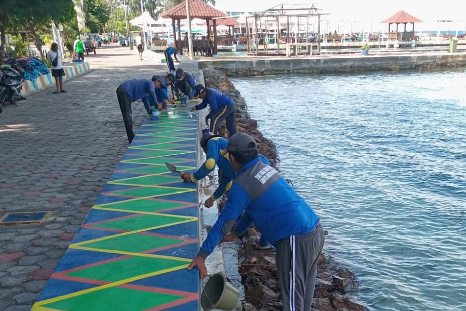 Petugas Suku Dinas Sumber Daya Air (SDA) Kepulauan Seribu, melaksanakan kegiatan pemeliharaan tanggul abrasi di sisi utara Pulau Pramuka, Kelurahan Pulau Panggang, Kecamatan Kepulauan Seribu Utara.Kegiatan tersebut ..