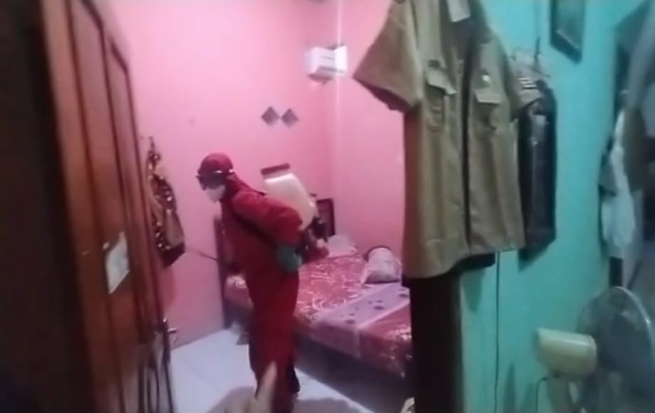 Petugas Suku Dinas Penanggulangan Kebakaran dan Penyelamatan (Sudin Gulkarmat) Jakarta Utara dan Kepulauan Seribu, melakukan penyemprotan cairan disinfektan di rumah Pulau Lancang, Kelurahan Pulau Pari, Kepulauan Seribu ..