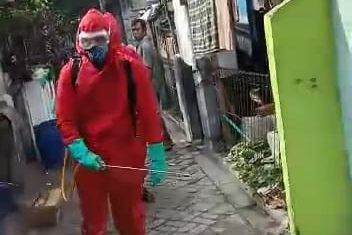 Petugas Sektor 7 Suku Dinas Penanggulangan Kebakaran dan Penyelamatan (Sudin Gulkarmat) Jakarta Utara dan Kepulauan Seribu, melakukan penyemprotan disinfektan di lokasi permukiman RT 003/01, Kelurahan Pulau Harapan, Keca ..