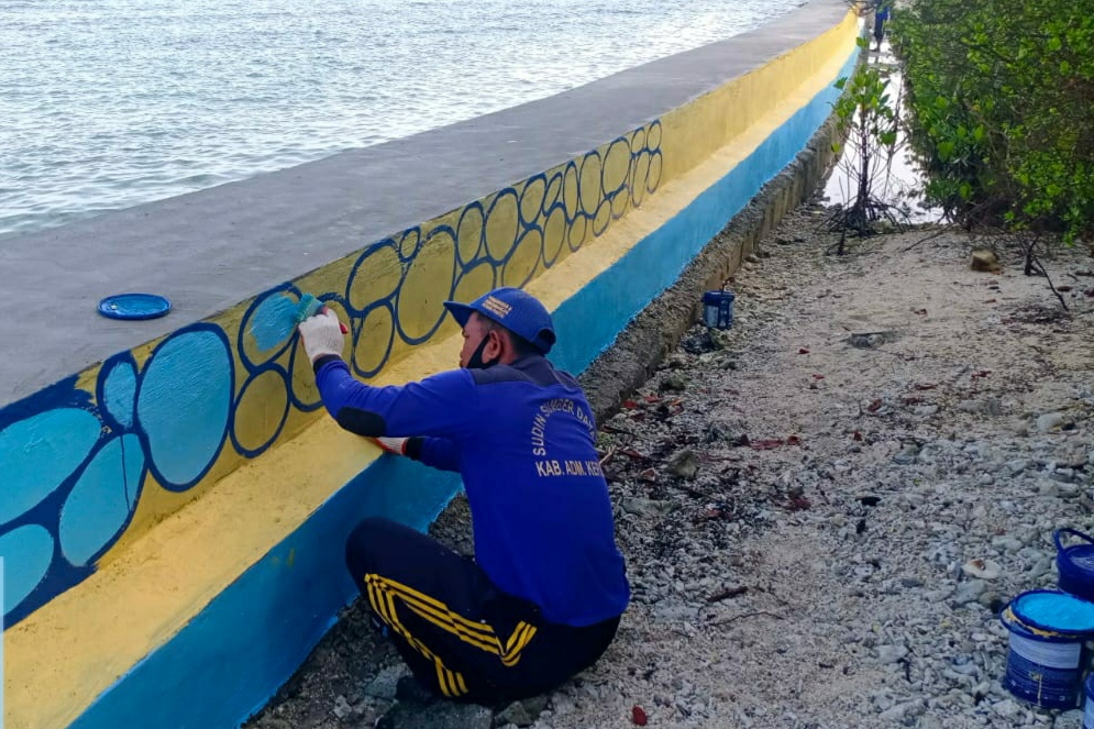 Petugas Suku Dinas Sumber Daya Air (Sudin SDA) Kepulauan Seribu mempercantik dinding tanggul pembatas di sisi barat Pulau Sebira, Kelurahan Pulau Harapan, Kecamatan Kepulauan Seribu Utara.Menurut Kepala Sudin SDA Kepulau ..
