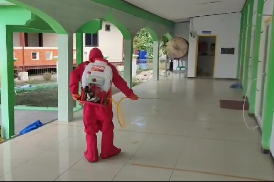 Petugas Sektor 7 Suku Dinas Penanggulangan Kebakaran dan Penyelamatan (Sudin Gulkarmat) Jakarta Utara dan Kepulauan Seribu melakukan penyemprotan disinfektan di Masjid Jami Nurul Bahri, Pulau Sebira, Kelurahan Pulau Hara ..