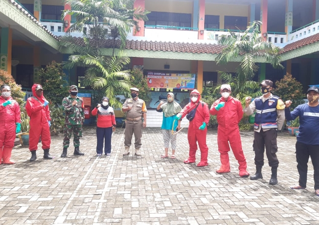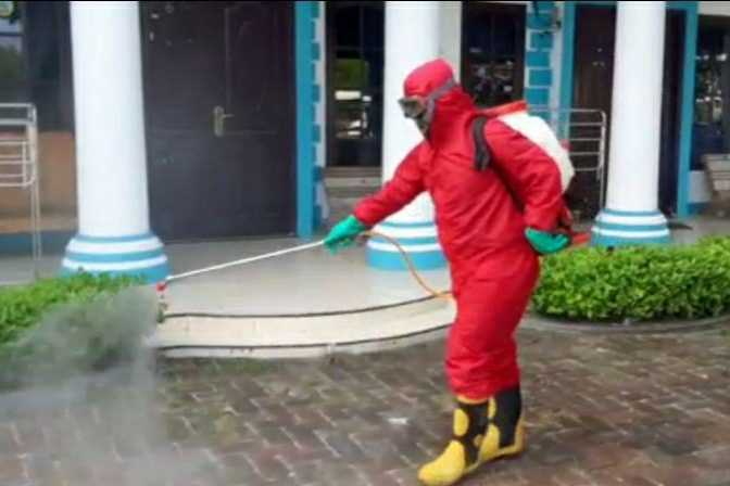 Petugas Sektor 7 Suku Dinas Penanggulangan Kebakaran dan Penyelamatan (Sudin Gulkarmat) Jakarta Utara dan Kepulauan Seribu, melakukan penyemprotan cairan disinfektan di dua sekolah di Kelurahan Pulau Kelapa, Kecamatan Ke ..