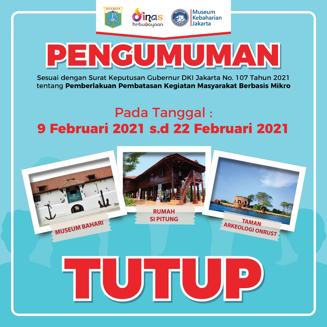 Unit Pengelola Museum Kebaharian Jakarta memastikan Taman Arkeologi Onrust yang ada di Kepulauan Seribu diperpanjang masa penutupannya.Langkah ini dilakukan usai Pemerintah Provinsi DKI Jakarta kembali memperpanjang masa ..