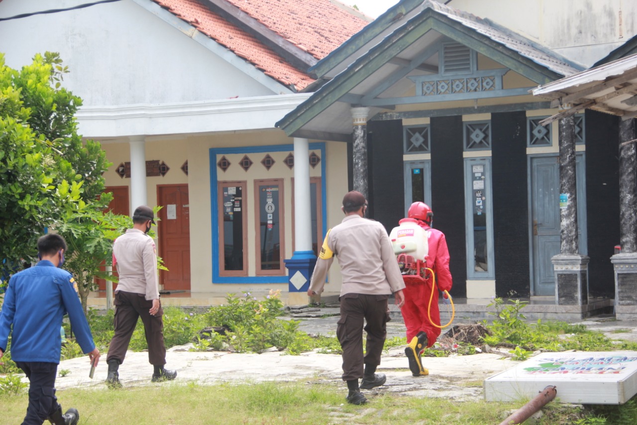 Balai Warga RT 001/04 Pulau Parmuka, Kelurahan Pulau Panggang Kecamatan Kepulauan Seribu Utara disemprot cairan disinfektan oleh petugas Sektor 7 Suku Dinas Penanggulangan Kebakaran dan Penyelamatan (Sudin Gulkarmat) Kot ..