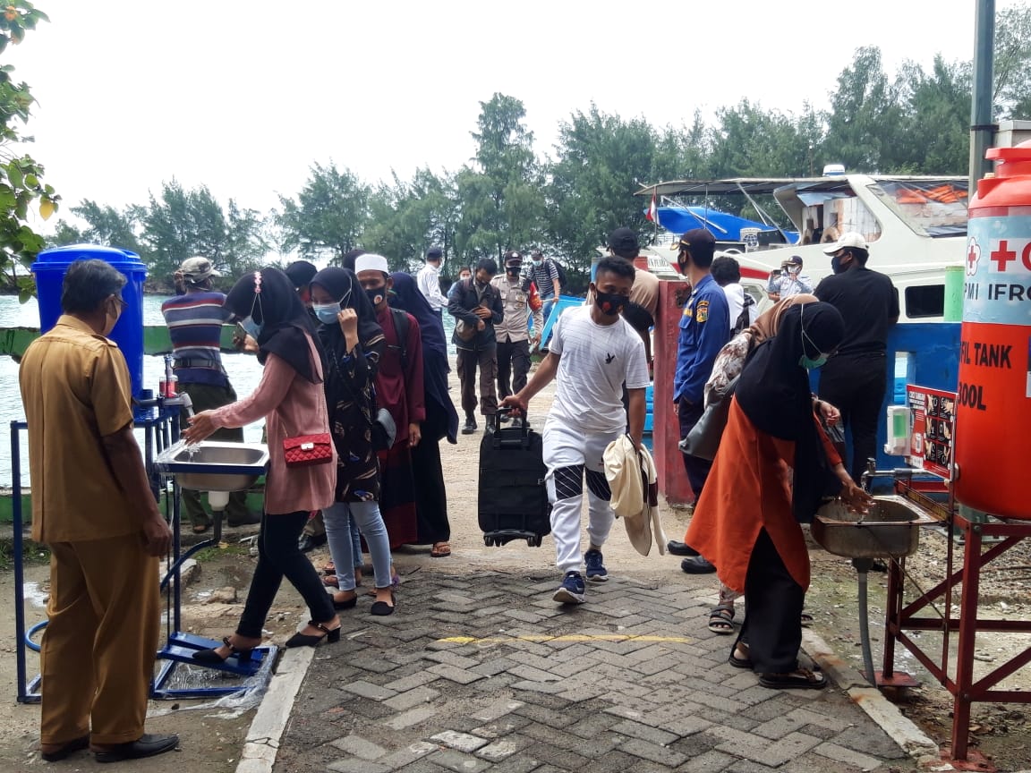 Petugas gabungan Pulau Pramuka, Kelurahan Pulau Panggang, Kecamatan Kepulauan Seribu Utara melakukan kegiatan rapid test kepada wisatawan yang baru tiba di dermaga. Tercatat kegiatan petugas gabungan yang te ..