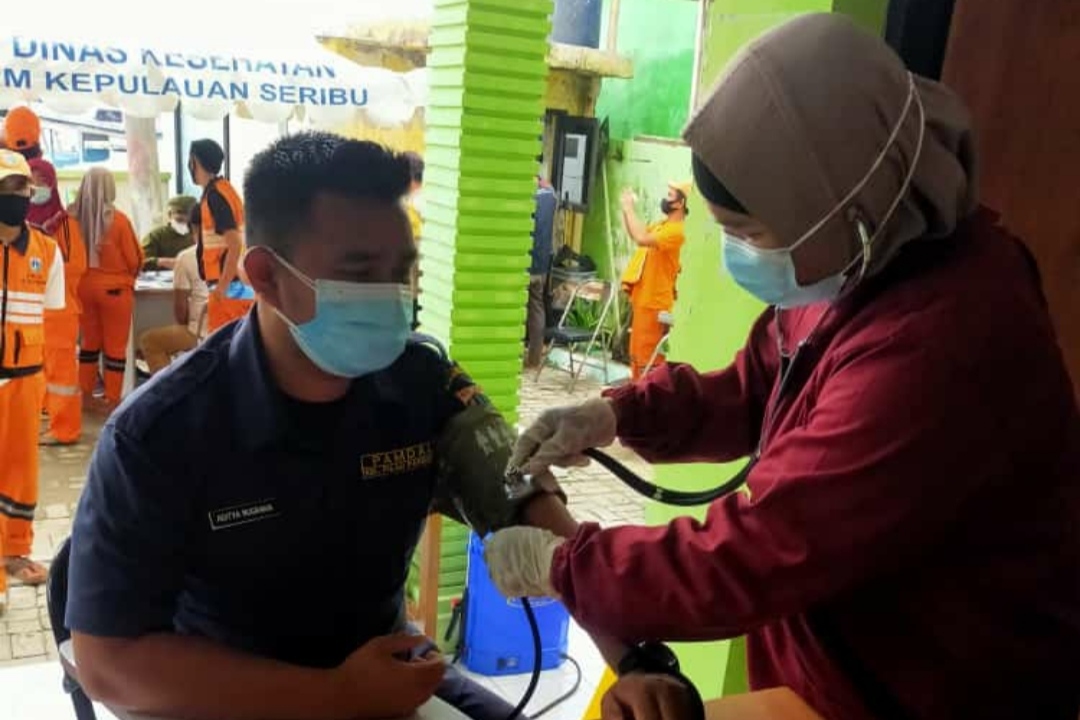 Aparatur Sipil Negara (ASN) dan petugas Penanganan Prasarana dan Sarana Umum (PPSU) Kelurahan Pulau Panggang, Kecamatan Kepulauan Seribu Utara menerima vaksinasi Covid-19 tahap pertama.