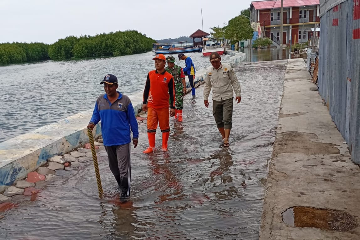 Petugas gabungan Kelurahan Pulau Harapan melakukan penanganan cepat untuk mengurangi debit air dan membantu warga terdampak banjir rob