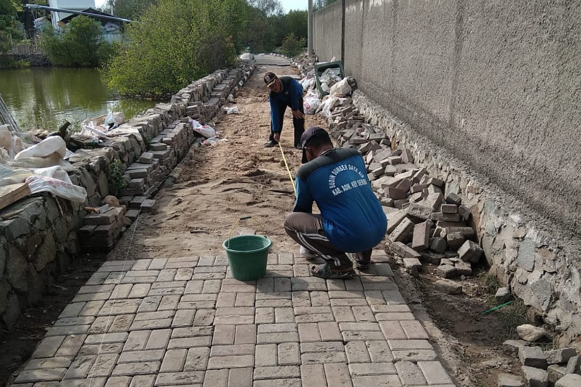 Petugas Sudin SDA Kepulauan Seribu Memperbaiki Jalan di Kelurahan Pulau Untung Jawa